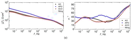 Bode plots of AO, APO, and ACO coatings made after the following immersion times: (a) 3 h; (b) 24 h; (c) 168 h.