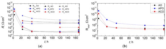 Resistance values obtained from the fitting of the EIS experimental data for AO, APO, and ACO coatings: (a) Rtop, Rin, and Rct; (b) Rtotal.