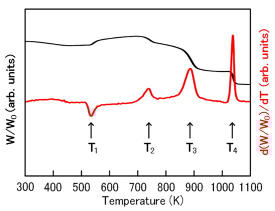 The thermal stability of the Fe-N powder is a crucial criterion for producing bulk magnets. Thus, the thermo-magneto-gravimetric curve of the Fe-N powder was examined. The result is shown in Figure 4. In the thermo-gravimetric curve, four peaks (T1, T2, T3, and T4) are observed. The summary of the thermomagnetic studies of the Fe-N powder is shown in Table 2. The T1 peak is considered to be the decomposition temperature of the α″-Fe16N2 phase: α″-Fe16N2 → α-Fe + γ-Fe4N. Its decomposition temperature was 539 K, much lower than the Curie temperature of the α″-Fe16N2 phase (810 K) [29] but close to another reported value (523 K) [12]. The T2 peak is considered to be the Curie temperature of the γ-Fe4N phase [30]. The T3 peak is considered to be the eutectoid reaction temperature (γ-Fe → α-Fe + γ-Fe4N). The T4 peak is considered to be the Curie temperature of the α-Fe phase. This confirms that the α″-Fe16N2 phase decomposed into the Fe4N and α-Fe phases at 539 K.