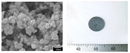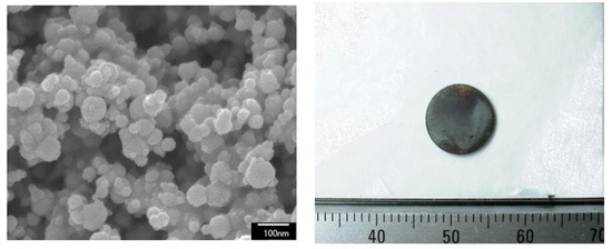 Photographs of the Fe-N powder (left) and the Fe-N magnet (right) produced from the Fe-N powder at 373 K by the SPS-DC method.