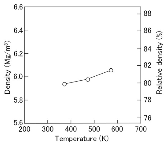 Although the Fe-N powders were consolidated at low sintering temperatures, the Fe-N magnets were nevertheless successfully produced, and the results from examining their densities are shown in Figure 6. The density of the magnets increased from 5.94 Mg/m3 (relative density of 79.8%) at 373 K to 6.06 Mg/m3 (81.5%) at 573 K. This suggests that higher consolidating temperatures promote the densification of Fe-N magnets by the SPS method. However, the poor thermal stability of the α″-Fe16N2 phase prevents any further increase in temperature.