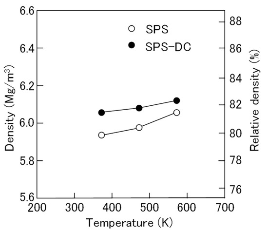 The densities of the Fe-N magnets produced by the SPS and SPS-DC methods are compared in Figure 8. At all consolidation temperatures, the density of the Fe-N magnet was higher in the SPS-DC method than in the SPS method and increased from 6.06 Mg/m3 (relative density of 81.5%) at 373 K to 6.12 Mg/m3 (82.3%) at 573 K. The magnets produced by the SPS-DC method had a relative density of >80% even when the powder was consolidated at as low as 373 K, as confirmed by the TEM images (Figure 9), in which the amount of Fe-N powder particles, indicative of the density, seems to increase with the consolidation temperature.