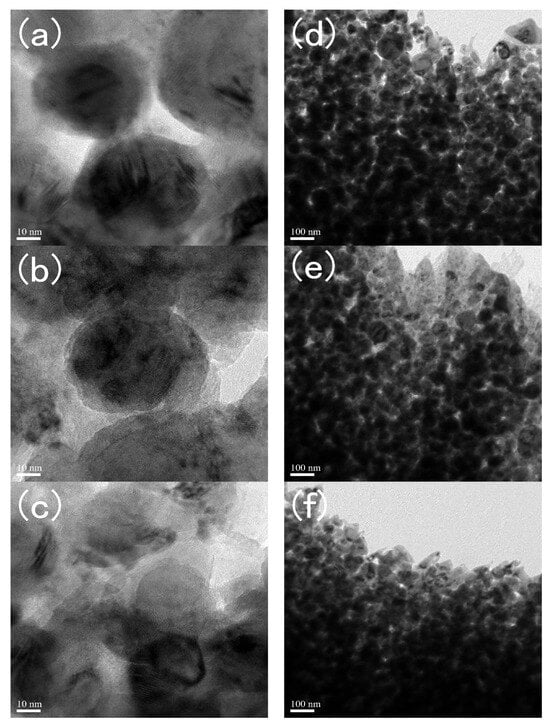 TEM images of the Fe-N magnets produced at (a,d) 373 K, (b,e) 473 K, and (c,f) 573 K by the SPS-DC method. The images represent the original Fe-N powder particles where the particles’ surfaces melted and bonded together.