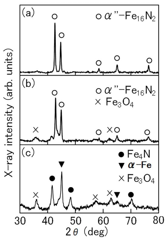 - Ogawa, T.; Ogata, Y.; Gallage, R.; Kobayashi, N.; Hayashi, N.; Kusano, Y.; Yamamoto, S.; Kohara, K.; Doi, M.; Takano, M.; et al. Challenge to the synthesis of α″-Fe16N2 phase compound nanoparticle with high saturation magnetization for rare earth free new permanent magnetic material. Appl. Phys. Express 2013, 6, 073007. [Google Scholar] [CrossRef]