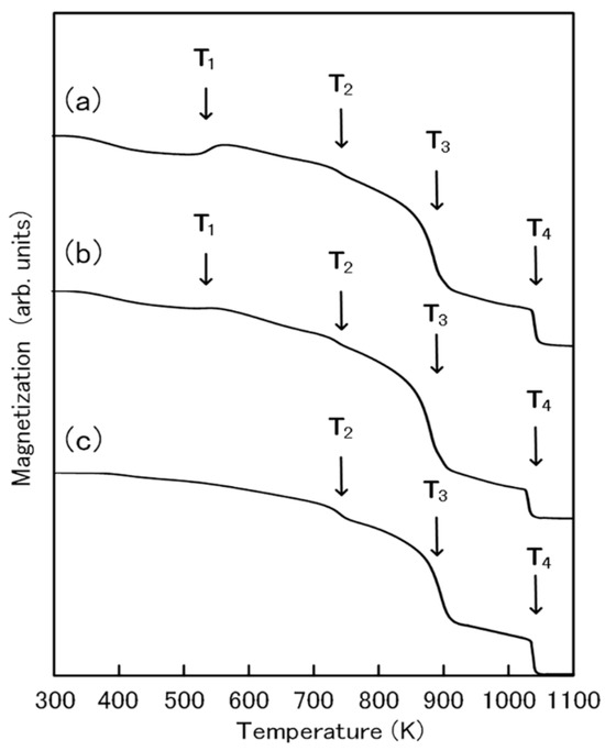 Figure 11 shows the thermo-gravimetric curves of the Fe-N magnets produced by the SPS-DC method. These thermomagnetic curves show clear magnetic transitions (T1, T2, T3, and T4): T1 is the decomposition temperature of the α″-Fe16N2 phase, T2 is the Curie temperature of the γ-Fe4N phase, T3 is the eutectoid reaction temperature, and T4 is the Curie temperature of the α-Fe phase. These results correspond to the thermomagnetic studies of Fe-N powders (Figure 4, Table 2). In the thermomagnetic curve of the magnets produced at 373 K and 473 K, four magnetic transitions (T1, T2, T3, and T4) are observed. On the other hand, only three magnetic transitions (T2, T3, and T4) are seen in the thermomagnetic curve of the magnet produced at 573 K. This confirms that the magnet produced at 573 K did not contain the α″-Fe16N2 phase. Since the consolidation temperature of 573 K was higher than the decomposition temperature of the α″-Fe16N2 phase, the α″-Fe16N2 phase decomposed into the α-Fe and Fe4N phases during the consolidation.