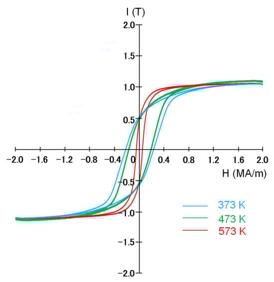 The hysteresis curves of the Fe-N magnets produced at 373, 473, and 573 K by the SPS-DC method.