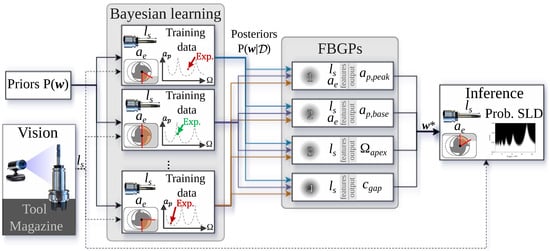 This study followed a probabilistic perspective to propose an industrial-friendly solution by offering two main advantages: (i) eliminating the complexities and efforts associated with physics-driven models and (ii) reducing the need for extensive large training datasets associated with data-driven models. Section 2 presents the methodology of using Bayesian learning to learn probabilistic SLDs for given tool–holder combinations, and it employs a Fully Bayesian Gaussian Process (FBGP) to propagate knowledge with the degree of certainty to other tool–holder and process configurations. This approach does not require human effort and merely necessitates an ordinary camera installed inside the machine’s tool magazine and a microphone to detect chatter based on process noise. The effectiveness of the proposed approach was investigated through experimental studies, as presented in Section 3, and the paper is concluded in Section 4.