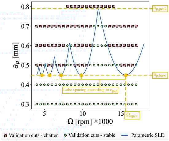 As previously introduced, SLDs delineate the boundary of the critical depth of cut as a function of the spindle speed, exclusively for a given machine and process configuration . In this study, the characteristic shape of SLDs for a single-mode system was assumed to be generated through a second-order polynomial that is defined by four parameters: the unconditional depth of cut under which the process remains stable regardless of the spindle speed, the depth of the cut at the last peak for the maximum attainable cutting depth, the spindle speed at the last valley that adjusts the lobe placements depending on the most flexible vibration mode, and the pocket spacing scale that adjusts the frequency of the appearance of the lobes in the SLD based on the number of cutting teeth. Figure 2 presents an exemplary case where the parametric SLD is tuned to align with experimental cutting tests. The agreement between the two suggests the validity of using such a parametric SLD to represent actual stability boundaries. Nevertheless, in general, the lobes may not necessarily be symmetric, and such additional complexities can be considered by introducing extra parameters to the formulation of the parametric SLD.