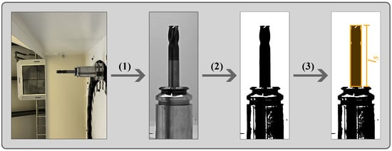 Image processing steps for the estimation of tool stick-out length: (1) the raw image is cropped, rotated, and converted into grayscale; (2) the grayscale is converted into a binary image based on a brightness threshold; (3) the tool region is detected, and the stick-out length is estimated.
