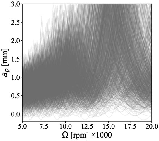 The experimental chatter observations that are used for training are listed in Table 4. The training points are used for each case through Bayesian learning (in Section 2.3) to refine the distribution of SLD parameters from their prior to posterior distributions, as listed in Table 5. The prior distribution embraces a wide and general range of feasible parameter values based on the insights and understanding of the milling stability. As shown in Figure 5, Monte Carlo samples from prior distributions generate multiple parametric SLDs, which are overlaid to visually represent the variability in stability predictions. The broad range of possible SLDs and the lack of distinguishable stability pockets highlight the considerable uncertainty in the initial predictions and emphasizes the need for further learning and refinement. As an optional advantage, the selection of priors also allows the algorithm to benefit from the experience of machine operators that can guide and facilitate learning with a lower number of training data.