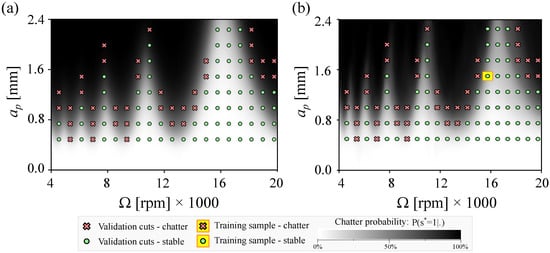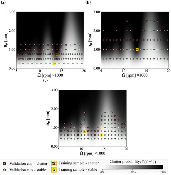 In instances where data are limited, Bayesian learning enables effective learning by quantifying the probability of predictions and the underlying uncertainty, known as epistemic uncertainty. Ostad Ali Akbari et al. [] proposed a physics-supported probabilistic artificial intelligence technique to refine stability predictions with a limited number of experimental training datasets, where uncertainties in the tool–holder assembly model [] and cutting force coefficients are refined through Bayesian learning. Within a federated learning concept, they leveraged the physics-based models to enable knowledge transfer between various machines sharing similar components, leading to enhanced stability prediction even for unseen but comparable configurations. The remaining uncertainties in the model were further utilized for active data collection through active learning. While the resulting probabilistic SLDs were useful for informing machine operators about the reliability of predictions, this hybrid approach requires the establishment of a sufficiently comprehensive physics-based model and the measurement of machine tool dynamics through inverse receptance coupling [] or indirect identification techniques [].