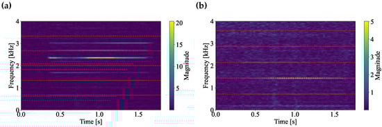 Process noise spectrum analysis for chatter detection in case D: (a) unstable cut at = 10,000 rpm and mm; (b) stable cut at = 10,750 rpm and mm. The red dashed lines indicate the harmonics of the tooth-passing frequency.