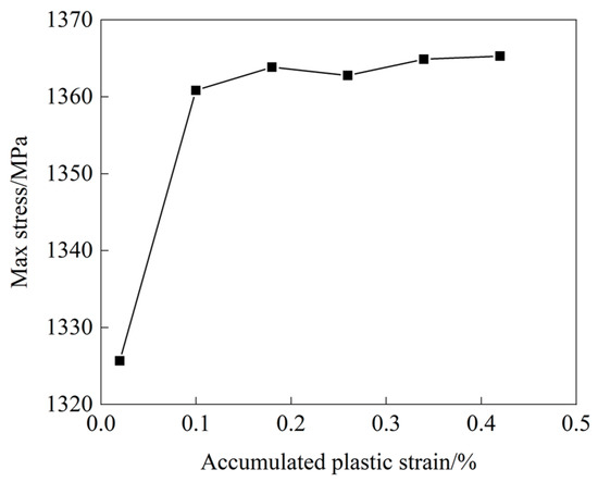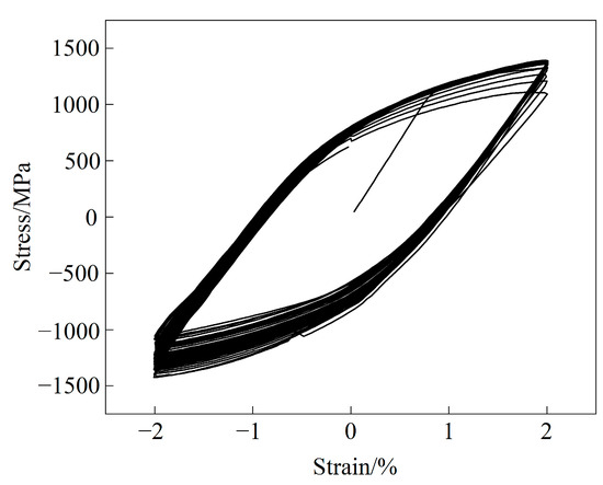 Due to the presence of isotropic hardening, the effect of isotropic hardening must be removed before determining the kinematic hardening parameters ζ(k) and r(k) [18,19]. Assuming that the cyclic hardening is reflected only by isotropic hardening, the relationship curve of the evolution of the cyclic maximum stress σmax with the accumulated plastic strain p can be obtained from strain-controlled cyclic loading tests under a certain strain amplitude. Figure 3 shows the stress–strain curves under uniaxial strain cycling with a strain amplitude of 2%, and Figure 4 gives the relationship between the maximum stress σmax and the accumulated plastic strain p in each cycle. Fitting the curves shown in Figure 4, we can obtain the following function reflecting isotropic hardening: