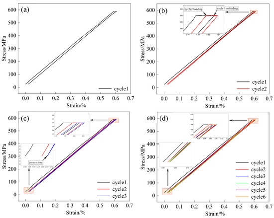 Finally, from Figure 6d, it is found that the curves always maintain the closed characteristic after unloading in the 4th, 5th and 6th cycles, and there are no more new plastic strain increments, ∆εp = 0. The curves in the last three cycles overlap with each other, the area enclosed by the strain–stress curve is similar, the plastic strain energy ∆wp ≠ 0, and the specimen enters a special “self-balancing” state after unloading is completed in the 3rd cycle.