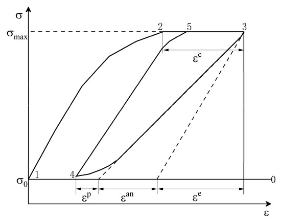 Since the peak stress is relatively low, the plastic and visco-plastic strains during the loading and unloading stages are neglected. Ratchet strain is defined as the average of the maximum strain εmax and the minimum strain εmin per cycle [15,24], noting that this definition of ratchet strain includes both creep strain and accumulated plastic strain. Thus, the various components of strain, namely elastic strain εe, creep strain εc, residual strain εre, anelastic strain εan, and ratchet strain εr, can be expressed as follows: