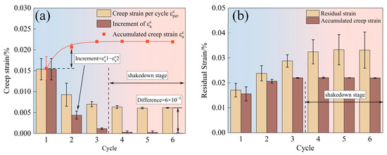 The variation of creep strain εc and residual strain εre are shown in Figure 8. During the initial stage, the creep strain per cycle is large at the beginning and then decreases rapidly. It decreases to a stable value in cycle 3 (transition stage). In the plastic shakedown stage, the amount of creep strain per cycle shows similar quantities. This implies that the accumulated creep strain gradually increases, but the growth rate gradually decreases, as shown in Figure 8a. It reaches the maximum accumulated value in cycle 3, and afterward, the accumulated creep strain remains at this value. Creep strain presents the above law because the initial stage of cycle corresponds to the initial creep stage with a faster creep rate, so with the same stress-holding time, the creep strain is larger. While in the plastic shakedown stage, the specimen gradually enters the steady creep stage, the creep rate decreases and is relatively stable, and the creep strain is smaller and consistent [25]. Additionally, the creep strain per cycle is greater than the increment of accumulated creep strain , especially in the plastic shakedown stage, indicating not all of the creep strain in the stress-holding phase is retained in specimens.