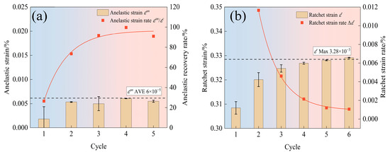 The variation of ratchet strain εr is different from that of anelastic strain εan, as shown in Figure 9b. The ratchet strain εr gradually increases and approaches a maximum value in the initial stage, which remains constant in the plastic shakedown stage. Ratchet strain rate is defined as the increment of ratchet strain relative to the previous cycle (i.e., dεr/dN). The ratchet strain rate decreases rapidly and reduces to nearly 0% in the 3rd cycle, after which the ratchet strain caused by stress cycling no longer increases. The lowest point of decreasing ratchet strain rate is also in the 3rd cycle, i.e., the plastic shakedown transition point, which indicates that the phenomenon of anelastic recovery not only slows down the accumulated creep strain rate, but also reduces the ratchet strain rate [29]. Because anelastic recovery can reduce the accumulation of creep damage in the material [30], this is one of the most important reasons for the specimen to exhibit plastic shakedown.
