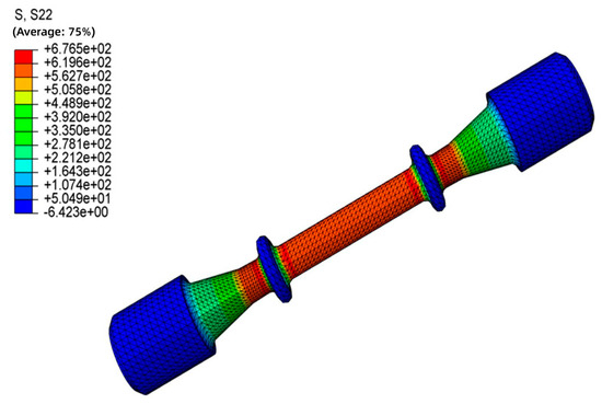 To verify the accuracy and adaptability of the shakedown theory model and material parameters, the simulation of the CF test is carried out using Abaqus software 2022 under the same conditions. The geometry used in this model is a Φ5 mm bar with an axial load of 11781N applied at one end, and the other end is completely fixed; then, the model is meshed with tetrahedral C3D4 cells, and finally, 49,678 cells are divided, and the model of the loaded state is shown in Figure 10.