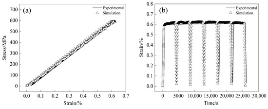 - Based on the plasticity–creep superposition model, a theory model for the CF shakedown behavior of Ti17 alloy is established. This model can accurately describe the shakedown behavior of Ti17 alloy at 300 °C, and the relative error between the simulation and experimental results can be controlled within 4%.