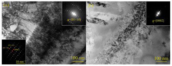 During the initial stage of CF tests, the dislocation density is low and the dislocation pile-up is not serious. The resistance to dislocation slip is weak, resulting in low deformation resistance. Therefore, during the initial cycles, especially cycle 1, the specimen experiences significant strain, with all strain components being large. After undergoing substantial plastic deformation, dislocations rapidly multiply within favorably oriented α phases. Due to the limited number of slip systems in titanium alloy α phase, it is widely believed that the activation of slip primarily occurs in the basal or prismatic <a> slip systems [33,34]. As a result, the dislocations within the α phase mainly originate from the same slip system, and the dislocation lines exhibit a parallel morphology. Figure 13 shows the dislocation slip lines in two-beam images as observed by TEM. The type of dislocation can be determined according to dislocation invisibility criterion: if the Burgers vector b is normal to the operating vector g, g·b = 0. For titanium alloys with an HCP structure, Table 4 lists the common dislocation Burgers vector and determination criterion [35]. When the operating vector g = [01−10], the observed dislocation lines in the TEM images can be determined as <a> or <a + c> type dislocations. In Figure 13b, when the operating vector g = [0002], the observed dislocation lines at the same position disappear. Only <a>-type dislocation lines would disappear under the operating vector g. Therefore, it can be concluded that the observed parallel dislocation lines are <a>-type dislocation lines.