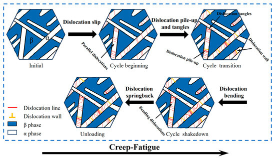 Based on the above discussion, the micro-mechanisms of plastic shakedown of Ti17 alloy under CF loading are summarized in Figure 15, which shows a certain region in the basket-weave structure of Ti17 alloy. The dislocations within the α-phase in the as-received material can be neglected. Ti17 alloy undergoes the dislocation slip in the initial stage. Then the dislocation plugs and entangles, continuously inducing dislocation climbing in the transition stage. Finally, the dislocation bending during stress-loading and the re-straightening during unloading reach a balance, a plastic shakedown state is manifested in the macroscopic state.