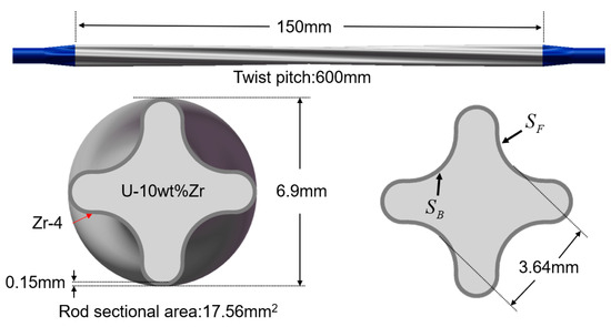 To enhance the economic benefit of nuclear energy, it is imperative to achieve power updates or extend the refueling cycle in Pressurized Water Reactors [1]. An advanced U-Zr metal-based helical cruciform fuel (HCF) has been developed recently by Lightbridge [2,3,4]. In the HCF rod, the U-Zr metallic fuel core is metallurgically bonded with the zirconium alloy cladding. In comparison to oxide fuels like UO2, the U-Zr metal fuels generally exhibit superior thermal conductivity and facilitate easier fuel recovery [5,6]. Furthermore, Zr-containing uranium alloys demonstrate excellent corrosion resistance and dimensional stability during thermal cycling [7]. These inherent advantages position uranium–zirconium alloys as an exceptional choice for nuclear reactor fuels. In fact, the concept of HCF was first proposed by the Soviet Union [8,9]. Compared to the traditional cylindrical fuels, the HCF rods possess a higher surface-to-volume ratio, enabling increased heat output and promoting enhanced cross-mixing characteristics among the liquid channels. Additionally, each HCF rod contacts the surrounding rods at multiple planes along the assembly length, eliminating the need for spacer grids due to their self-spacing traits [10]. As a result, the U-Zr metal-based HCFs have a promising application prospect in future advanced nuclear reactors.