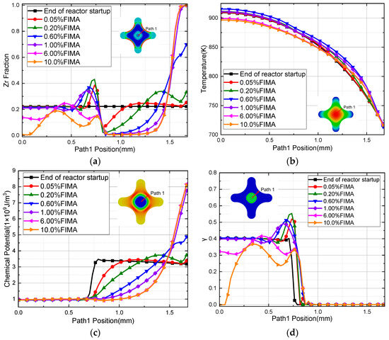 Figure 6b depicts the contour plots of the temperature, the chemical potential, the γ phase fraction and the Zr atom fraction at the end of reactor startup. The highest temperature of ~909 K appears in the center of the fuel rod, and the lowest temperature of ~622 K locates in the fuel rod blade. It can be known that distinct temperature gradients are formed within the fuel meat. Figure 6a denotes that the magnitude of temperature gradient along Path 1 is enhanced near the path end, with the proceeding of temperature increase. Compared to those near the fuel rod elbow, the magnitude of temperature gradients surrounding the fuel rod blade are much lower. It can be also found that the higher values of the γ phase fraction only exist around the central region of the fuel meat. Correspondingly, the chemical potentials in this α + γ phase region are greatly reduced from the initial value of ~2.81 × 109 J/m3 to the current value of ~0.78 × 109 J/m3. It is noted that near the boundary of the lowest chemical potential, the values of the local chemical potential are observed to increase sharply and then decrease, achieving a highest value of 3.5 × 109 J/m3. This region corresponds to that with a decrease in the γ phase fraction from ~0.4 to ~0 in Figure 6a. Actually, this is a result of the fact that the equilibrium atomic fractions decrease due to the presence of the γ phase in the central region. From Equation (21), it can be seen that the chemical potential is related to , and hence a sudden change is formed at the interface of α + γ phase and the pure α phase. Also, the chemical potential is temperature dependent, so in the pure α phase region the chemical potential decreases with decreasing temperature. Consequently, a high magnitude of chemical potential gradient is formed around this transition region. During the reactor startup, the Zr atom fraction is nearly the same as the initial value of ~0.22, due to the considerably short time period.
