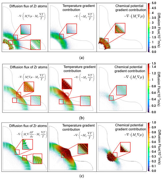 The diffusion flux of Zr atoms and the corresponding contributions of temperature gradient and chemical potential gradient (a) after reactor startup (Arrow Magnification: 1), (b) at 0.2% FIMA (Arrow Magnification: 2) and (c) at 1% FIMA (Arrow Magnification: 4).