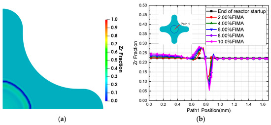 (a) Contour plots of Zr atom fraction at 10% FIMA without the irradiation enhancement effects and (b) the evolution results along Path1 from the end of reactor startup to 10% FIMA.