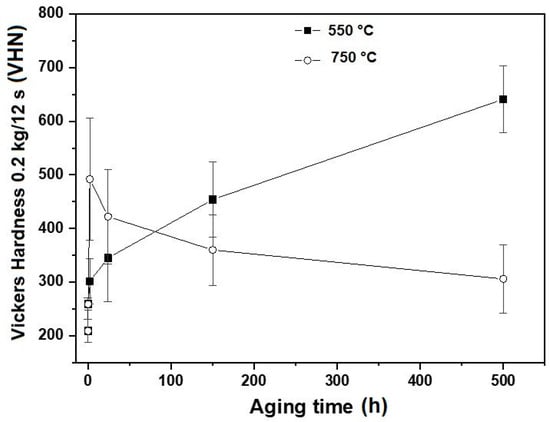 - The aging treatment at 550 °C caused the steel to age-harden because of the formation of fine intragranular κ precipitates, leading to an increase in hardness of up to about 630 VHN.