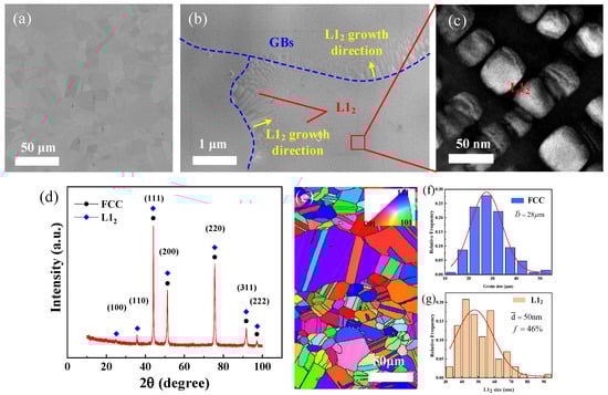 The initial microstructure of the AT0.1-A700 ME superalloy is shown in Figure 1. The alloy consists of equiaxed grains with precipitates present within the grains and at the GBs (Figure 1a,b). Specifically, the TEM dark-field (DF) image (Figure 1c) shows that spherical precipitates are evenly dispersed throughout the grain interior, whereas tapered-rod precipitates are located near the GBs. Both forms of precipitation are L12 phase, as indicated by XRD peaks (Figure 1d). An L12 phase with different morphology in the intragrain and GB has been observed in other (Al, Ti)-added M/HEAs [15,20,21]. This difference in morphology may be attributed to the distinct driving forces of precipitation at GBs compared to within grains. Our results also indicate that L12 precipitation near the GBs seems to have a greater driving force, causing faster growth towards the grain interior (Figure 1b). It is important to highlight that the current alloy does not contain other brittle intermetallic compounds commonly found in (Al, Ti)-added M/HEAs, such as Heusler phase [15,21], sigma phase [22], and D019 phase [16], which can deteriorate the high-temperature properties of alloys. The EBSD inverse pole figure (IPF) indicates that the alloy has a complete recrystallized microstructure with randomly oriented grains and annealing twins (ATs), with an average grain size of 28 μm, which was calculated from measurements of the length of the grain in multiple directions using ImageJ software (ImageJ 1.53t) (Figure 1f). The size and volume fraction of the L12 phase were measured by ImageJ software to be 50 nm and 46%, respectively (Figure 1g). The stacking fault energy (SFE) of the Ni2CoCr0.5Si0.3 matrix alloy was calculated to be 32.4 mJ/m2 by thermodynamic calculation method (see Note S1 in the Supplementary Information). It is noted that the actual SFE of the matrix may be lower as a result of the consumption of Ni and Al in the form of Ni3(Al, Ti).