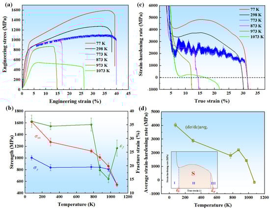 Mechanical properties of AT0.1-A700 ME superalloy over a wide temperature range from 77 K to 1073 K: (a) engineering stress–strain curves and (b) variations in yield strength (σy), ultimate tensile strength (σuts), and fracture strain (εf) with temperature; (c) strain-hardening rates versus true strain curves; (d) average strain-hardening values as a function of deformation temperature (the inset shows the calculation method of the average hardening rate).