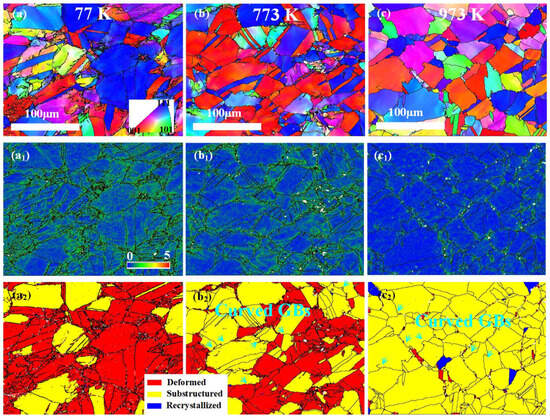 EBSD image of AT0.1-A700 ME superalloy after tensile fracture at 77–973 K: (a–c) IPFs deformed at 77, 773, and 973 K, respectively; (a1–c1) and (a2–c2) are the corresponding KAM and recrystallized fraction images, respectively, for 77, 773, and 973 K.