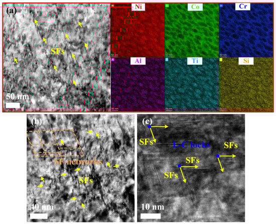 The microstructures of AT0.1-A700 ME superalloy were analyzed through TEM after tensile deformation at 298 K, as shown in Figure 4. The predominant observed deformation mechanism was the shearing of the stacking fault (SF) in both the matrix and precipitated phase, accompanied by a high number of dislocation movements. The TEM-EDS images (attached to the right in Figure 4a) clearly differentiate between the matrix and precipitated phase, with rich Ni, Al, and Ti content indicating L12 phase precipitation. During deformation, SFs near the precipitation boundary cut through it (yellow arrow in Figure 4a), causing elongation and deformation of the precipitates into elliptical shapes. A large number of SF networks and L-C locks formed by multiple SFs shear, as shown in Figure 4b,c. This observation confirms that the primary deformation mechanism of the alloy, characterized by a high density of the L12 phase, is mainly driven by SF-mediated dislocation activities [20]. SFs, particularly SF networks and L-C locks, have been demonstrated to significantly enhance the work-hardening ability of alloys due to their significant dynamic pinning effect on dislocations [20,34]. This enhancement can be attributed to two main factors, namely the low SFE of the matrix and the limited spacing between precipitation phases preventing further development into twins. In the current MEA, the addition of Si can significantly reduce the SFE [18], together with the substantial 46% fraction of the L12 phase, which contributes to the deformation mechanism associated with SFs.
