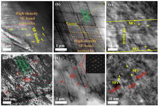 Figure 5 shows the deformation microstructure of AT0.1-A700 ME superalloy after tensile fracture at 77 K. Abundant SF networks formed by high-density intersecting SF bands can be observed in most grains (Figure 5a), with SF bands typically measuring 10–30 nm in thickness (Figure 5b). Enlarged views of SF bands in Figure 5c illustrate their composition of a matrix sandwiched in multiple SFs on both sides, contrasting with the shorter and narrower SF networks at room temperature. The formation of SF bands at 77 K is attributed to increased deformation, continuous accumulation, and expansion of SFs. These SF networks, made up of SF bands, have a more significant effect on dislocation pinning and storage, leading to enhanced strain-hardening effects (refer to Figure 5b for dislocation entanglement between SF networks) [35]. Additionally, a few deformation twins (DTs) are present in the alloy deformed at 77 K, as shown in Figure 5d,e. These DTs, along with the SF network, contribute significantly to dislocation pinning and storage, as evident in Figure 5d, with abundant dislocation entanglement between twin forests. Examination of the twin boundary in Figure 5f reveals numerous short SFs surrounding it. Overall, cryogenic deformation results in more abundant SF band networks and DTs, as well as high-density dislocation entanglements, serving as the primary deformation mechanisms. The interface resistance between the L12 phase and matrix typically hinders the expansion of SFs into bands or the formation of twins [16,20,36]. However, at 77 K, higher stress and lower SFE reduce the resistance, allowing for the formation of long, thick SF bands and twins. This, in turn, enhances the strain-hardening effect of dislocations and improves the flow stress.