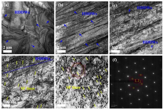 As shown in Figure 6, the formation and interaction of high-density dislocation walls (HDDWs) are present in most deformed grains (see Figure 6a) following tensile deformation at 773 K, serving as the main deformation characteristics. These HDDWs, formed by the accumulation of slip bands, exhibit a complex microstructure, with the dislocation walls intersecting in multiple directions, as shown in Figure 6b. Detailed examination of the HDDWs shows dense dislocation entanglement within the walls (see Figure 6c). Additionally, short and thin fault lines are observed within the HDDWs and other regions lacking dislocation walls (see Figure 6e), causing shear in the L12 precipitates. The presence of these fault lines is confirmed by the diffraction spots in Figure 6f. This research highlights that while room-temperature and cryogenic deformation show abundant stacking fault (SF) activities, including twin activities, deformation at 773 K is primarily governed by a small amount of SF activities and a significant presence of HDDWs. This shift in deformation mechanism is attributed to the increase in SFE and the decrease in flow stress at elevated temperatures.