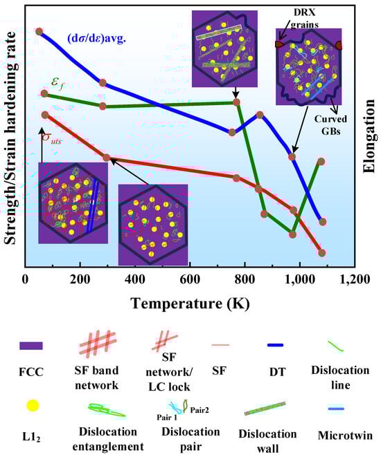 The mechanical properties of alloys at a wide range of temperatures, including yield strength, ultimate tensile strength, strain hardening, and plasticity, are influenced by multiple factors. In recrystallized single-phase polycrystalline metals, yield strength is linked to temperature-dependent lattice friction, solution strengthening, and GB strengthening. At lower temperatures, like those of liquid nitrogen or liquid helium, the crystal lattice contracts, increasing interatomic binding force and enhancing resistance to dislocation slip activation. This results in a significant rise in yield strength explained by the Peierls–Nabarro stress [44]. Solid solution strengthening occurs when atoms with different properties enter the lattice, impacting lattice friction, so that it can generally be folded into the lattice friction of the solid solution [45]. While GB strengthening is often seen as temperature-independent at low temperatures, its temperature sensitivity becomes more significant at higher temperatures, particularly in fine- and nano-grained metals [46]. This sensitivity deviates from the traditional Hall–Petch relationship. For example, in nanocrystals, the presence of numerous grain boundary defects leads to their movement or migration during deformation at temperatures above medium levels, diminishing the effectiveness of the GB strengthening effect [46]. In precipitation-strengthened alloys, the strengthening effect due to temperature is influenced by the temperature of the precipitation phase and the interface between the second phase and the matrix. The temperature-dependent yield strength in current alloys is affected by lattice friction, solid solution strengthening, GB strengthening, and L12 phase strengthening. However, the complex nature of the temperature-dependent L12 phase strengthening effect lacks a comprehensive physical model to explain the temperature-dependent stress anomaly throughout the entire process [24]. Therefore, it is typically approached phenomenologically or empirically [47,48].
