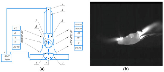 The essence of the MMAW process, reprinted from Ref. [3]: (a) is a block diagram of electrode melting and seam metal formation; (b) is an image of the process of electrode-metal droplet transfer. 1: clad metal; 2: base metal; 3: slag; 4: electrode flux; 5: metal electrode rod; 6: gas atmosphere; 7: slag phase of the molten electrode droplet; 8: metal phase of the molten electrode droplet.
