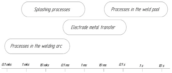 Processes [27] occurring in the welding zone have a characteristic duration ranging from 0.1 µs to 0.1 s (Figure 2). Therefore, the operational properties of the deposited metal can be improved by increasing the transfer coefficient of alloying elements from covered electrodes, minimizing losses of alloying elements into the slag and gas components, as well as by thermally affecting the chemical composition of the electrode metal droplet.