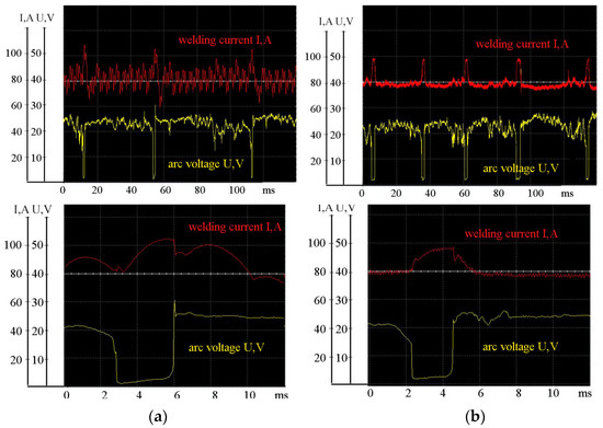 Works [2,54,57,58,59,60,61,62] established that the reduction of the size of the transferred droplets of the molten electrode metal contributes to the defect-free welds and to the increase of the impact strength of the seam metal at low temperatures. We analyzed and statistically processed the oscillograms of current and voltage in the welding circuit (Figure 4) when using power sources with different forms of energy conversion. The results obtained are presented in Table 2 and Figure 5.