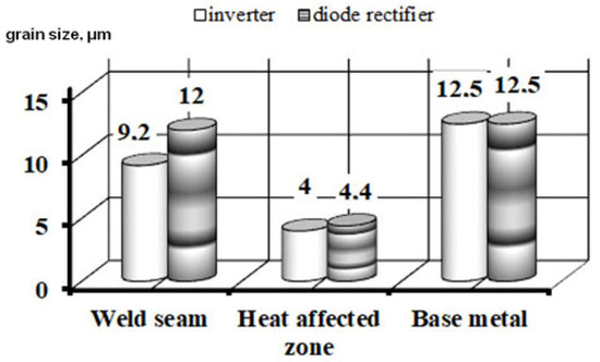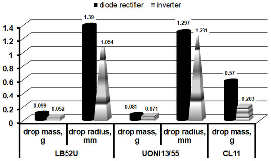 The analysis of the data in Table 5 and Figure 7 revealed that the use of the inverter rectifier allows for a reduction in the volume of the transferred drop of electrode metal up to 37%, which provides a more stable transfer of fine drops.