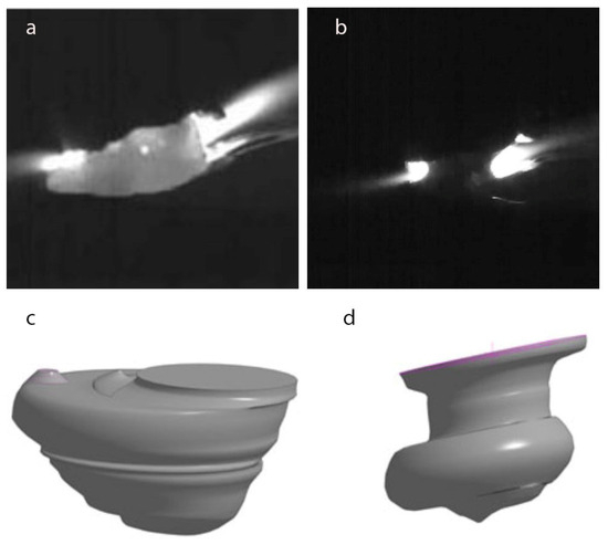 Experimental studies with high-speed motion pictures were carried out to confirm the adequacy of the obtained results of the theoretical calculation presented in Table 5. The high-speed movie images were processed by the simulation and visualization method [63] (Figure 8), which confirmed the obtained calculation data presented in Table 2.