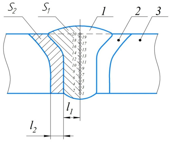 - Welding of 10 mm-thick plates made of steel 45 (joint type C17) was carried out using the following welding technique (Figure 3): the welding was performed in four layers with electrodes. The root pass was conducted with UONI 13/55 electrodes (d = 3 mm) at a welding current of 80–90 A. The filling was conducted with UONI 13/55 electrodes (d = 4 mm) at a welding current of 120–130 A. Before welding, the parts were preheated to 300 °C and then slowly cooled with asbestos fiber insulation until they were completely cooled.