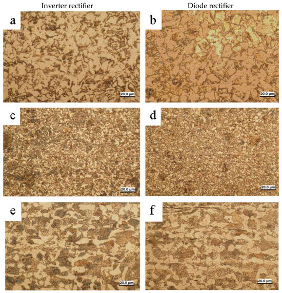 Different patterns of current change in the welding circuit and arc voltage between the electrode and the workpiece, shown in Figure 4 and Figure 5, can be explained from the point of view of higher-quality indicators of rectified voltage. The conversion frequency of the inverter power source can reach up to 200 kHz, while that of the diode rectifier can reach up to 300 Hz. This parameter affects the voltage ripple factor of the rectifier, reaching 25% in inverters and 65% in diodes [2,3,55]. Given the above considerations, it can be reasonably concluded that at a thermal time constant of 10−5–10−3 s in a shorter interval of current failure, the interelectrode gap lacks the requisite time to cool down and deionize significantly. Consequently, the use of electrodes with fewer ionizing elements in the coating when welding from an inverter rectifier is more reasonable due to a more stable process of arc burning.