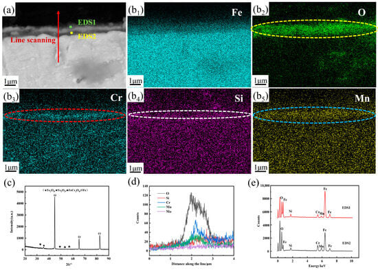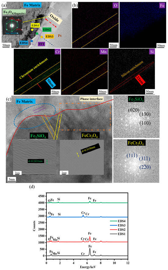 - 38Cr3MnNbVMo hot-stamped steel shows the unique microstructure and element distribution characteristics of the Cr-Si-Mn oxide layer. Cr and Si are used as the core elements of the oxidation resistance of ultra-high-strength steel. The ultra-thin oxide layer is composed of Fe3O4, Mn oxide, FeCr2O4, Cr2O3, and Fe2SiO4. The Si element is easier to oxidize, and an ultra-thin Fe2SiO4 alloy oxide layer is formed at the matrix interface. It collaborates with the oxides of Cr and Mn to hinder the inward diffusion of external O ions and the outward diffusion of matrix Fe ions.