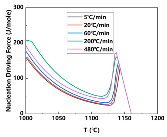 According to the results in Figure 2, under slow cooling conditions (such as 5 °C/min), although the low cooling rate provides a longer time for atomic diffusion [25,26], the degree of supersaturation in the material is not high, and the nucleation driving force for the precipitation phase is weak. This results in a slow formation of the phase, despite it starting at a higher temperature. Conversely, rapid cooling conditions (such as 200 °C/min) significantly increase the nucleation rate. Even though rapid cooling leads to a high degree of supersaturation in the material, which restricts atomic diffusion, it also increases the driving force for the precipitation process so that once nucleation has begun, the precipitation proceeds rapidly. It is observed that at a cooling rate of 480 °C/min, the initial nucleation driving force is greater than 200 °C/min. However, as precipitation progresses, the consumption of supersaturation due to early extensive precipitation, and the possible over-suppression of atomic diffusion by the high cooling rate, lead to a nucleation driving force that gradually becomes less than that at 200 °C/min. This also explains why, during subsequent precipitation, the precipitation temperature is higher and the nucleation rate is greater at a cooling rate of 200 °C/min compared to that of 480 °C/min.