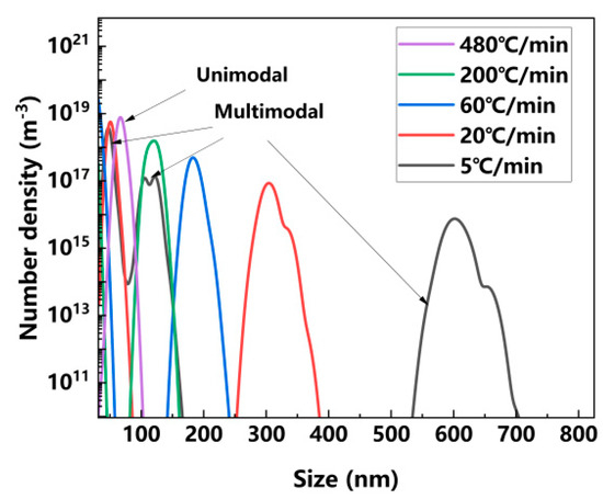As shown in Figure 3, cooling rates have a significant impact on the distribution characteristics of the phase [27,28,29], especially at lower cooling rates, such as 5 °C/min, where a multimodal distribution pattern of the phase is observed. During the initial high-temperature stage of cooling, due to the strong atomic diffusion, a large-sized phase can quickly form and grow. As the temperature gradually decreases, smaller precipitate phases begin to appear at existing or newly formed nucleation sites. Since the temperature is lower at this time, the migration speed of atoms slows down, leading to the formation of a smaller phase, thus resulting in a multimodal distribution characteristic [21,27,30,31,32].