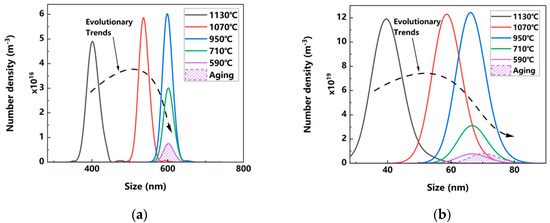 As shown in Figure 4 and in conjunction with Figure 1, it can be understood that during a precipitation process, for a slower cooling rate (such as 5 °C/min, Figure 4a), the nucleation rate is lower, and the size of the precipitate phase rapidly grows (from approximately 400 nm at 1130° C to 550 nm at 1070 °C). In contrast, for a faster cooling rate (such as 480 °C/min, Figure 4b), with a higher nucleation rate, the main precipitate phase consists of smaller-sized particles (with the same temperature change, from 1130 °C to 1070 °C, the size increases slightly from 40 nm to 60 nm).