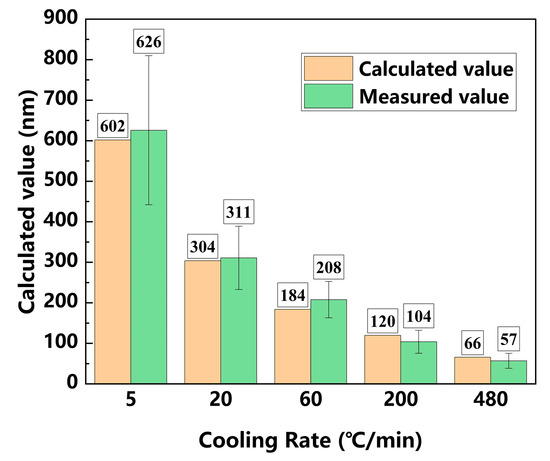 The statistical analysis of the aforementioned photographs was conducted using ImageJ. The comparison between the calculated results and experimental values is shown in Figure 6. It can be seen that the calculated average sizes under different cooling rates are in good agreement with the experimental measurement.