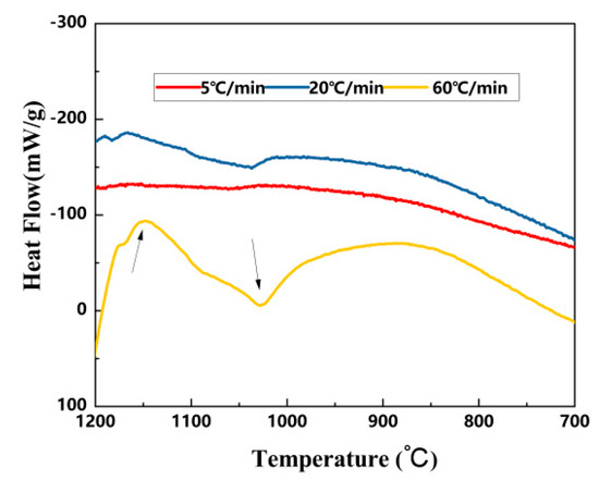 When a sample undergoes a phase transition (such as the dissolution or precipitation of strengthening phases), it experiences endothermic and exothermic effects, which manifest as peaks or valleys on the DTA curve. This makes DTA useful for analyzing the precipitation process of . According to the differential thermal analysis (DTA) results under different cooling rates shown in Figure 8, the curve begins to decline near 1150 °C, indicating the onset of phase precipitation. At a high cooling rate, such as 60 °C/min, a significant amount of phase nuclei and precipitates form, resulting in distinct endothermic and exothermic peaks on the DTA curve (indicated by black arrows). This suggests that significant phase transformations occur within the material during rapid cooling, closely related to the precipitation process of the material. When the cooling rate is 5 °C/min, the DTA curve becomes flatter, indicating that at a slower cooling rate, the nucleation and precipitation processes of the phase become relatively moderate, and the heat changes caused by phase transitions decrease, making the endothermic and exothermic peaks less pronounced. F. Masoumi et al. [42] used DTA to analyze the kinetic mechanism of phase reprecipitation in AD730 alloy, where different cooling rates led to different precipitation peaks, with faster cooling rates resulting in larger peaks. These results are consistent with the analysis conclusion from Figure 1, indicating that the cooling rate has a significant impact on the phase transition processes within the material, which in turn affects the final microstructure and properties of the material.
